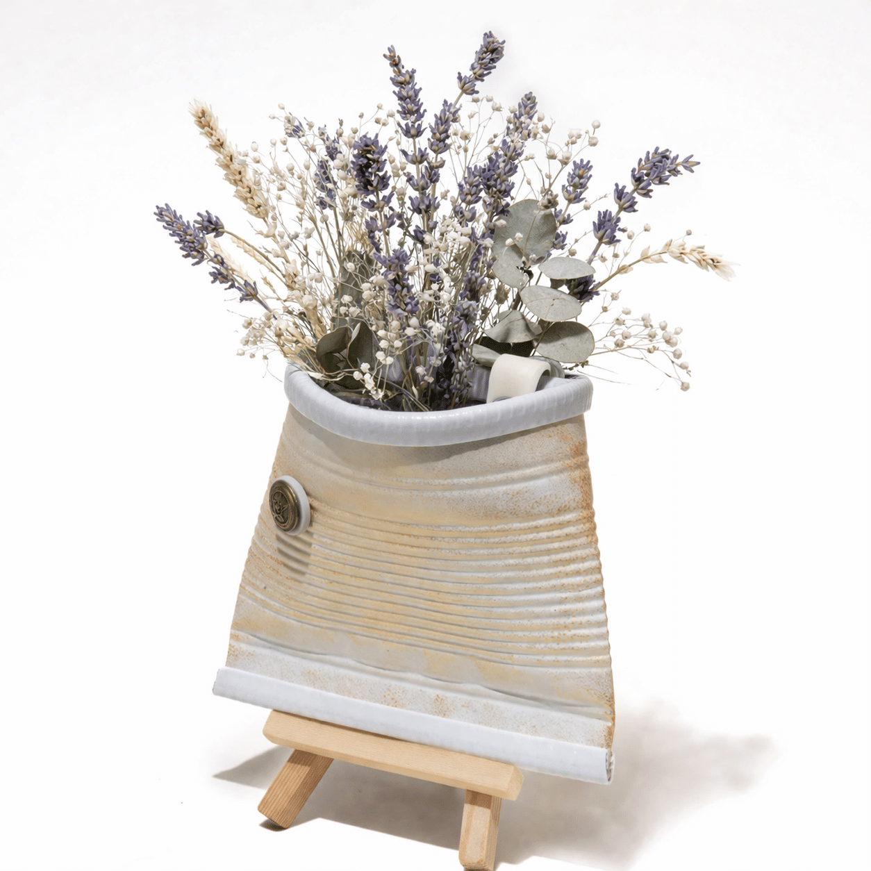 מעמד לעציץ של בעיצובה של האמנית פולה רייקין הוא מוצר המשלב עיצוב אקולוגי עם אסתטיקה כפרית וצבעונית.